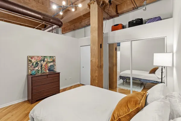 Located in one of the West Loop's premier full-amenity buildings, this 2BD + Den, 2BTH penthouse-level loft offers soaring timber ceilings, hardwood floors throughout, and a balcony with tranquil courtyard views. The open-concept layout is ideal for entertaining, with a spacious island kitchen, pantry, and stainless steel appliances. Enjoy full-service living with 24-hour door staff, a fitness center, yoga studio, theater, business center, and an expansive community lounge with outdoor terrace and grills. Enjoy the proximity to Fulton Market, the Loop, restaurant row, CTA, Metra, and major expressways. Zoned within the highly rated Skinner West, this home combines design, function, and an unbeatable West Loop location. First-floor garage parking available for $25K.