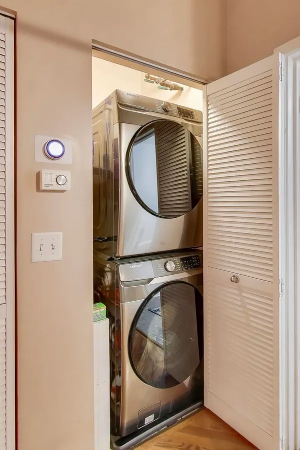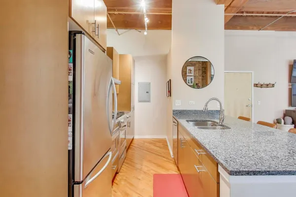 Experience elevated loft living in this spacious 1 bed + den, 1.5 bath brick and timber left in the heart of the West Loop. This beautifully appointed home features soaring ceilings, hardwood floors throughout, and oversized windows that overlook a serene interior courtyard-offering both privacy and abundant natural light. The updated kitchen is designed for both style and function, complete with stainless steel appliances, granite countertops, and a breakfast bar with seating-perfect for casual dining or entertaining. The expansive primary suite boasts a walk-in closet with organizers and a luxurious ensuite bath with a double vanity and steam shower. A versatile den with its own closet provides the ideal space for a home office, nursery, or guest area. The convenience of an in-unit stacked washer and dryer (2024) makes laundry easy. Step outside to your private balcony-perfect for morning coffee, evening relaxation, or grilling. Deeded attached heated garage parking space (P-285) additional $25,000. Generous 4' x 4' x 8' storage locker included. Residents of No. 10 Lofts enjoy full-service amenities including 24/7 door staff, on-site management, a fitness center, business center, conference room, yoga studio, home theater, and a beautifully designed community lounge with outdoor grilling space.